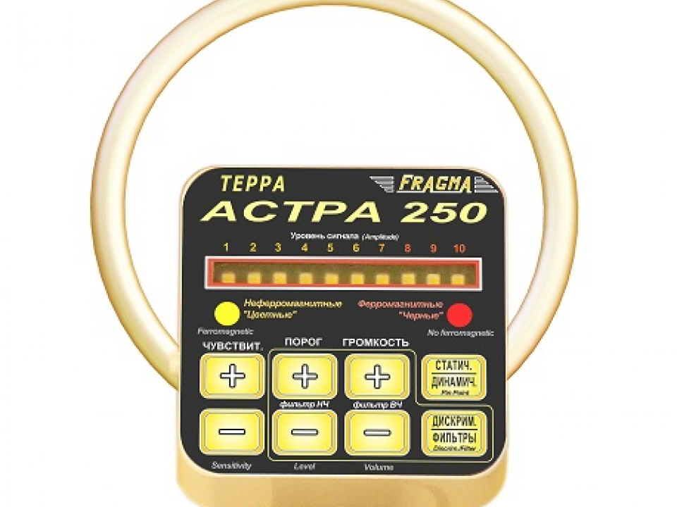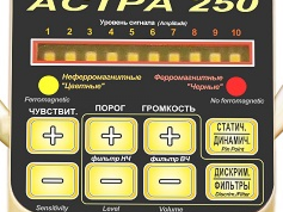 Астра - 250 имеет трехуровневый дискриминатор, и систему дискриминации по размеру объекта. Настройки фильтров позволят пользователю самому выбирать частотную полосу пропускания сигнала (задается нижняя и верхняя частота полосовго фильтра) для динамического режима поиска. Также возможно управление порогом сигнального срабатывания, что дает возможность пользователю добиться рекордных значений чувствительности в грунте и в замусоренной местности. В процессорном блоке встроен динамик звуковой индикации, также прибор имеет выход на наушники. Работа прибора в статическом режиме позволит вам в реальном времени отследить контуры металлического объекта(ов) залегающего под землей, и найти его центр массы. При полностью собранной штанге прибор имеет малые размеры и может применяться для операвтивного досмотра людей и багажа, также стен и ниш. Поисковая катушка прибора (датчик) выполнена в металлопластиковом корпусе, что обеспечивает высокую износостойкость даже при работе по гравию. Как и в других приборах нашего производства датчик полностью водонепроницаемый, т.е. можно осуществлять поиск под водой на глубине до 1 метра не погружая процессорный блок.